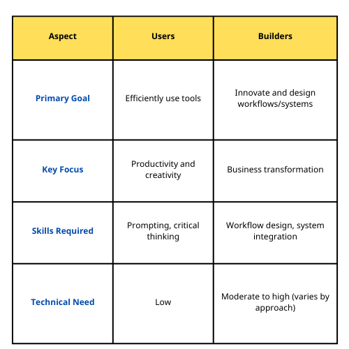 The critical distinction between users and builders lies in the scope of their engagement with AI. Users focus on applying existing tools to solve problems, while builders are constructing new tools or systems to drive innovation.